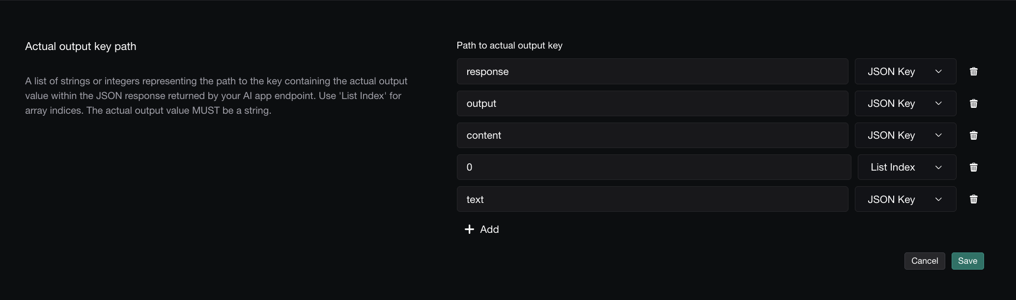 A list of strings or integers representing the path to the actual_output value in your JSON response. Use strings for JSON keys and integers for array indices. This is required for evaluation to work.