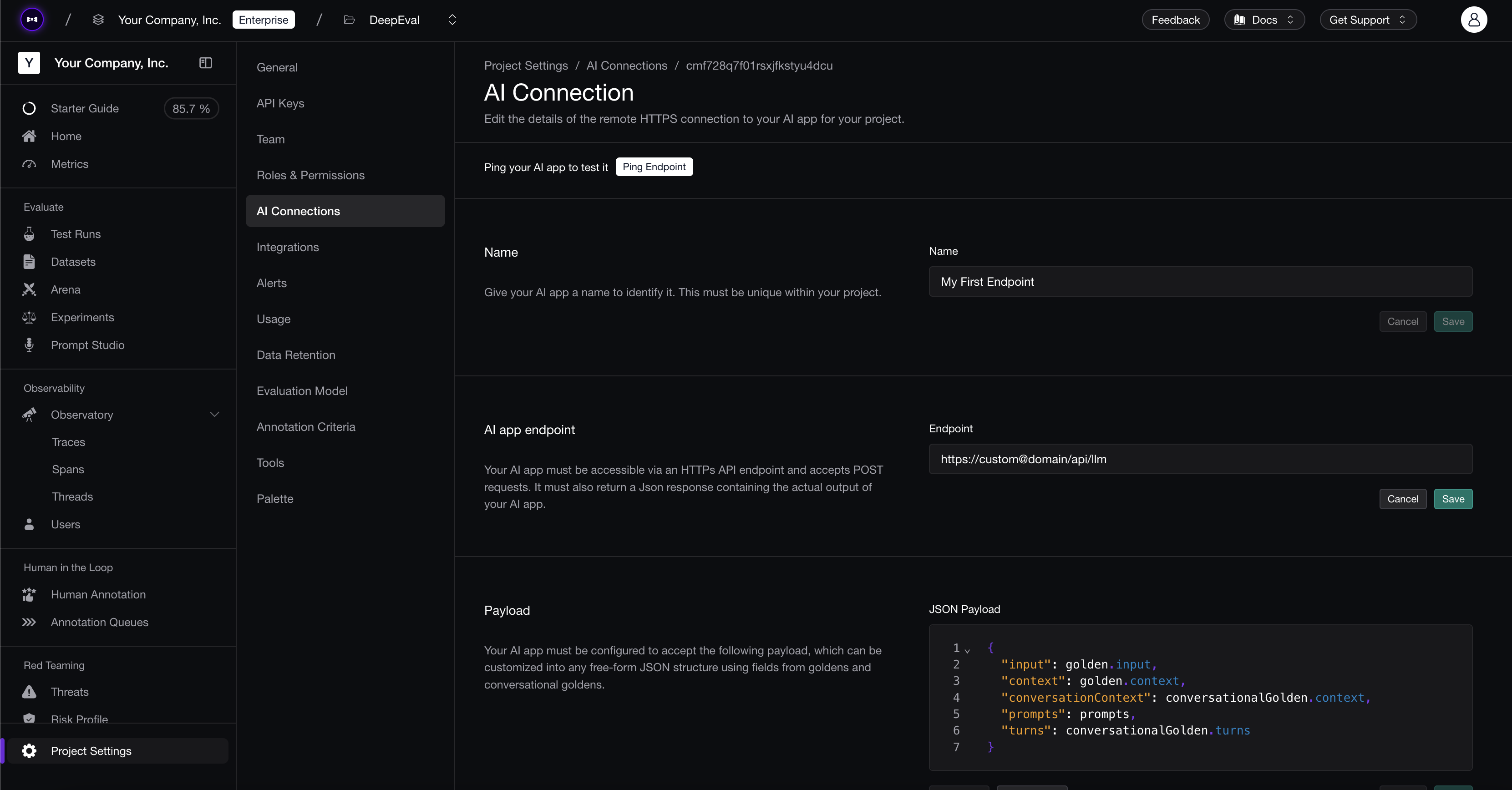 AI Connections let you run evaluations directly on the platform by connecting to your AI app via an HTTPS endpoint. Instead of writing code, you can trigger evaluations with a click of a button—Confident AI will call your endpoint with data from your goldens and parse the response.
