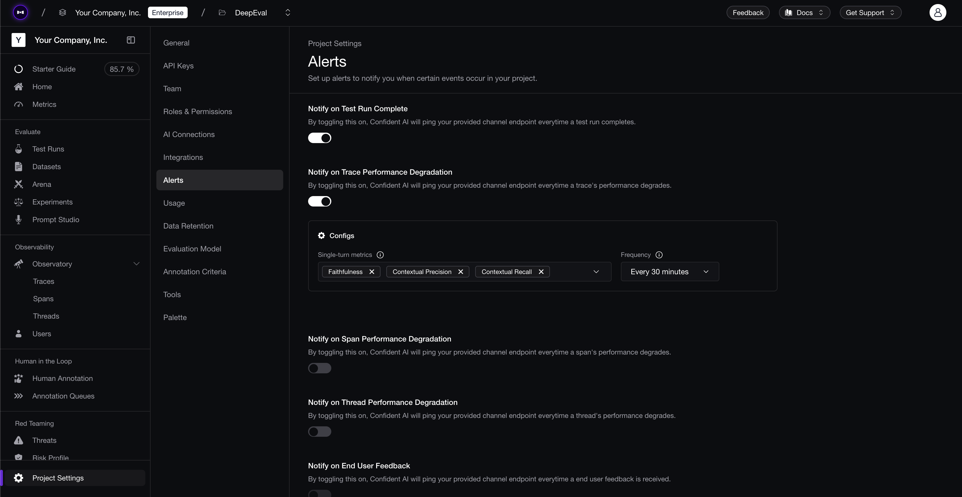 Set up alerts to notify you when certain events occur in your project. This is especially useful for live monitoring use cases.